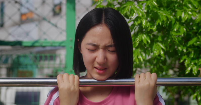 Mo-Du, a hairy and sweaty 14-year-old, makes it to the final round of a pull-up competition with the P.E. captain—but quits after being teased for looking like a boy. Later, at a uniform shop, she meets an older girl who looks just like her.